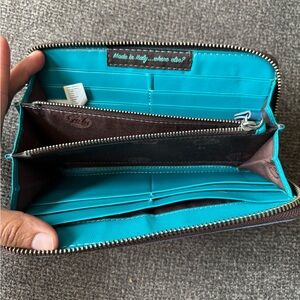 Vibrant wallet with intricate patterns. Features a mix of colors including blue, yellow, and brown.