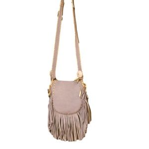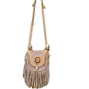 This is an adorable item. It's pure suede and is adorned with Sea Shells and simulated reptile. The purse is 8 inches long, 7 inches wide, and 3 inches deep. The length of the strap (folded) is 21 inches long ( on someone who is 5 foot 4 inches, would make the bag sit at the hip). The bag could fit a cell phone, a couple of tubes of lip care items, a compact mirror, keys, a pack of gum and a few smaller items. This bag is very unique as the brand is popular in Europe but not in the US.