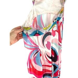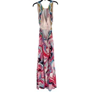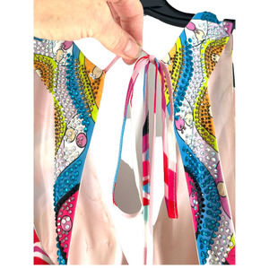 This gorgeous halter dress boasts colorful rhinestones around the waist. Low back style, tie at the neck. So flattering and sexy. The ultimate swanky dress! This Gai Mattiolo dress is a true statement piece and is easy to accessorize and style, you can opt for more of a simple heel and gold jewelry to complete your look.
