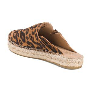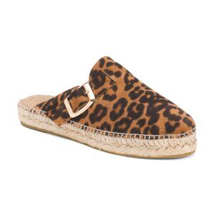 lightly padded leather footbed, espadrille edging, animal print design, open back, buckle strap detail, grip sole