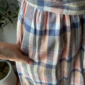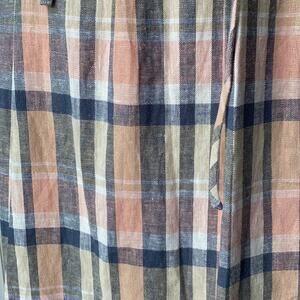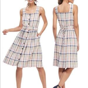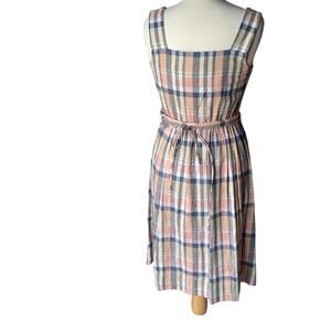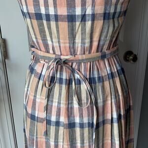 Fit: this style fits true to size. - Square neck and back - Sleeveless - Front button closure - 2 on-seam pockets - Buckle belt with tie-back closure - Plaid print - Linen blend construction - Lined - Approx. 43" length (size 8)