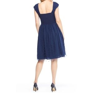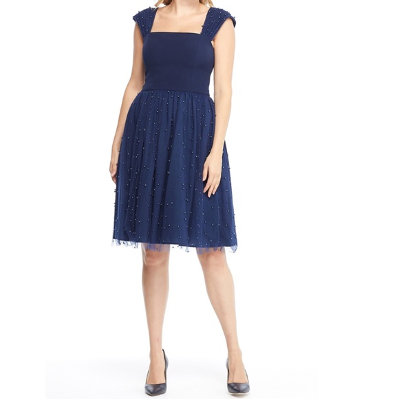 A vintage-look dress that's a welcome sight anytime is gorgeously structured in crepe and peppered with pearly beads at the shoulders and mesh skirt.