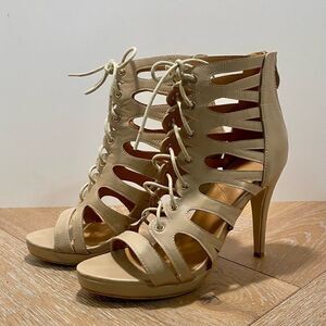 Style: GALERIE-18, Size 7 1/2 casual, sexy, stylish, and trendy these adorable dress sandals will complete any outfit! These open toe Strappy high heels feature laser cutouts, rounded toe, full lace up front and rear zipper closure for easy on and off. They are in excellent gently used condition With only a couple of small nicks, please see pictures as they are part of this description.