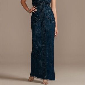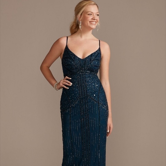 This stunning sheath dress is all decked out with beading, a flattering V-neckline, and spaghetti straps. A back slit allows you to move with ease.