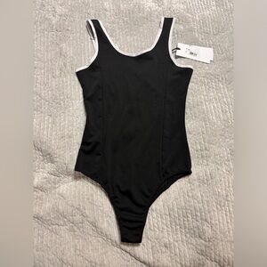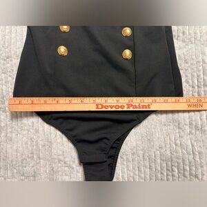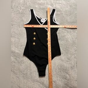 GAELLE Paris Swimsuit One piece design. Black with white trim. Gold faux buttons on front. Has stretch. See photos for measurements. Clean before wearing