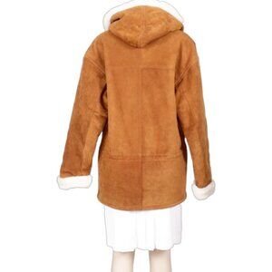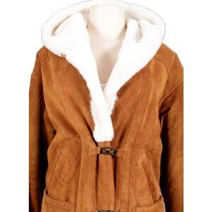 Brown Gallery suede leather jacket with faux fur trimmed hood and lining, two patch pockets on front, two slit pockets on front, hidden drawstring accent at lining, button closure at neck, hidden zip closure at center front and hook closures on front.