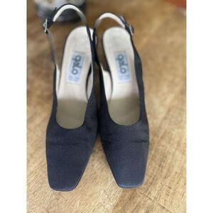 Women’s black slingback heels by Galo, made in Italy, size 37.5 (approx. US 7.5). Feature a flared high heel approx. 3.5” and a square toe. Outer material appears to be fine black textile despite sole marking “leather upper.” Leather lining and leather soles. Elegant and minimalist with adjustable buckle strap. Sole shows wear, otherwise excellent condition.