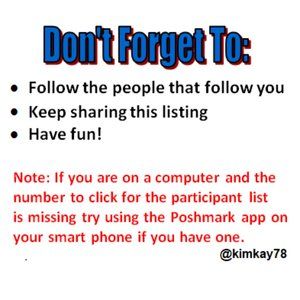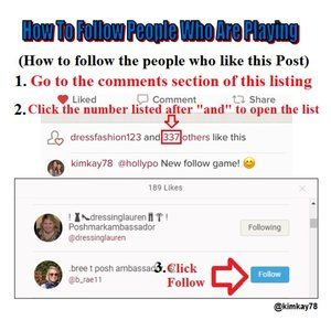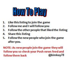@gracegboutique Hello Grace,  Thank you for joining my follow game. Please take a moment to follow me and the other people playing. There are instructions on how to play included in this listing. hope you have a great day! 😊