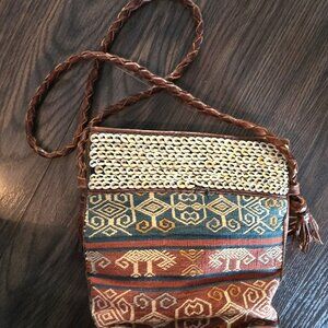This is an incredibly beautiful, genuine leather tribal style bucket bag Mad in Indonesia. Accented with genuine seashells. Woven tribal designed fabric exterior paired with seashells that have been individually sewn onto bag.. Interior is fully lined with printed fabric. One interior zipper pocket. Crossbody strap is constructed of braided leather. Sides are accented with leather tassels. Back is constructed of woven leather. Base of bucket bag is leather. The materials are very high quality. Gently loved and in wonderful condition with the exception of a bit of wear on the bottom/base. DIMENSIONS: 10.5" tall x 9" wide x 19" crossbody strap drop.