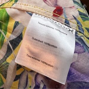 Absolutely stunning statement shirt from Ganesh featuring a bold, vibrant floral and botanical print! This eye-catching shirt showcases beautiful purple flowers with yellow, green, and coral accents on a cream background.
