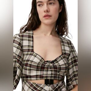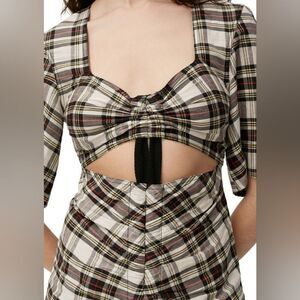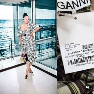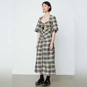 Characteristically bold in its finish, this GANNI midi dress is decorated with black and white plaid checks that are distorted through the use of gathering and ruching.