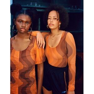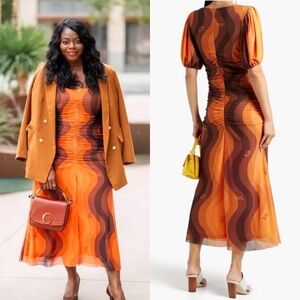 GANNI 70s Wave Print Recycled Mesh Scoop Neck Puff Short Sleeve Ruched Dress M