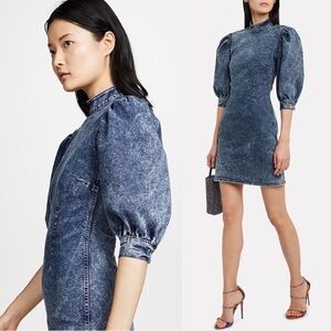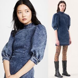 GANNI 90s Acid Wash Stretch Denim Puff Short Sleeve Mockneck Sheath Mini Dress M