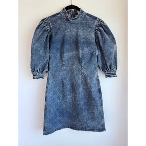 GANNI 90's Acid Wash Stretch Denim Puff Sleeve Mock Neck Cult Mini Dress Size 36