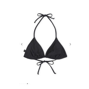 Stick to the basics with this classic triangle halter bikini top, finished with a little loop logo tag, removable padded cups, & adjustable string tie closures. Lined to prevent sheerness with removable padded cups