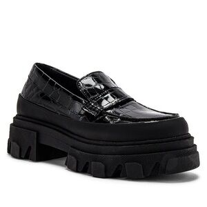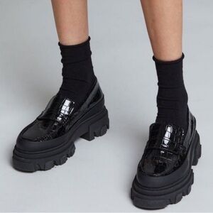 Ganni loafers, platform loafers, chunky loafers, black croc loafers, Ganni shoes, patent leather loafers, platform slip-ons, Scandinavian style shoes, Ganni chunky platforms, Ganni croc embossed.