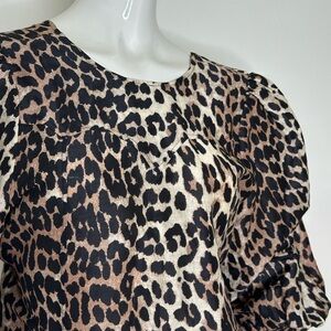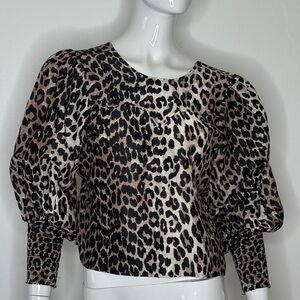 GANNI Cedar Tie Back Leopard Print Puff Sleeve Top Linen and Silk SZ 38