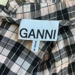 Turn heads in this striking GANNI Channa mini dress, featuring a bold black, white, and soft pink plaid print. The high ruffled neckline, dramatic shoulder ruffle, and tiered hem give it a vintage-meets-modern vibe with signature Scandi flair. Made from lightweight cotton blend, it’s perfect for transitional seasons and layering.