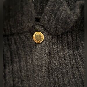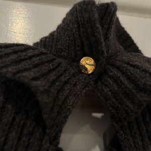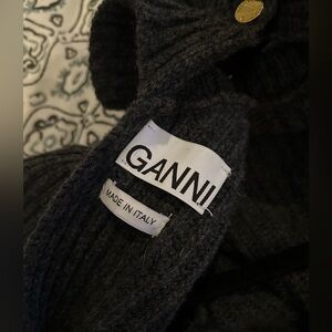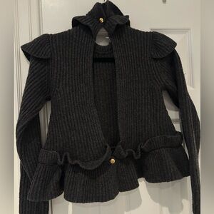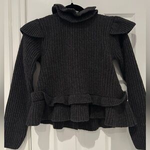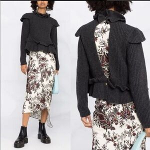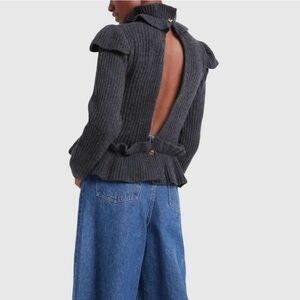 A beautiful charcoal gray sweater that’s stylish and cozy by Ganni. With its peplum detail, flounced shoulders and pretty open back, it’s a perfect piece to dress up or down.
