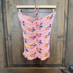 Sheer floral mesh halter top from GANNI featuring a flattering ruched front and soft pastel print. Lightweight and stretchy — perfect layered under a jacket for fall nights or worn solo for spring and summer.