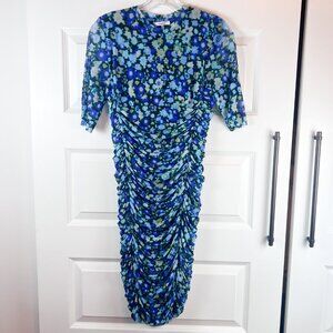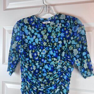 GANNI Floral Mesh Ruched Midi Dress in Azure Blue Sheer Size 4