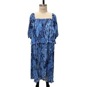 GANNI Floral Print Tiered Shirred Dress Midi Blue 42