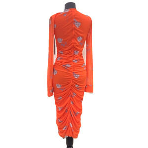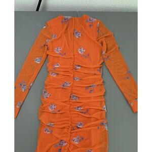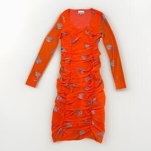 GANNI Floral Ruched Midi Dress Women's 38(6) Orange Long Sleeved Lined
