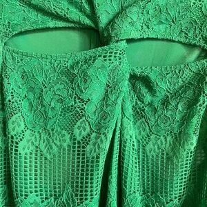 Beautiful condition, worn very little, vibrant green and lightweight, long sleeve lace dress with under-slip