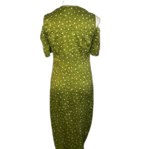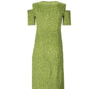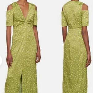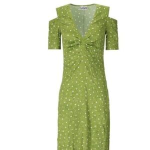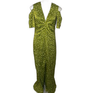 GANNI Green Polka Dot Maxi Dress Crinkle Shoulder Cut Out Slit