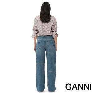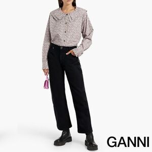 GANNI **NWT** Frost Gray Floral Print Cotton Poplin Double-Collar Shirt
