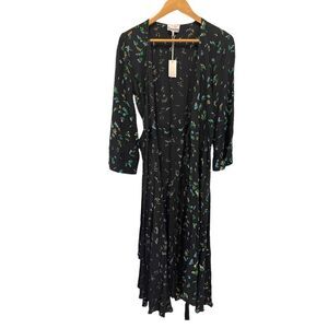 THE PRINTED CREPE WRAP DRESS IN VERDANT GREEN BY GANNI. A PRINTED WRAP DRESS WITH CROPPED FLUTE SLEEVES, FEATURING A VINTAGE-INSPIRED TONED-DOWN FLORAL PRINT ON SOLID BLACK. STYLE OPEN OVER JEANS, AS A JACKET OR WEAR ON ITS ON.