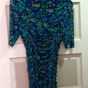 Feel edgy and cool in this blue floral mini dress by Ganni. Featuring a crew neckline and short sleeves, this dress is also ruched from bust to hem, giving it a captivating bodycon fit. Perfect for a night out, you’ll love the way you feel in this Printed Mesh Dress.