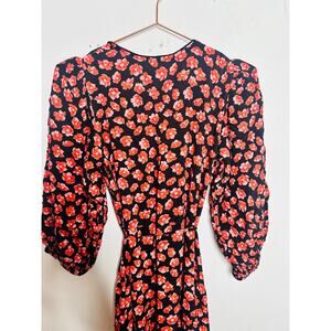GANNI Red Black Floral Wrap Puff Sleeves V-Neckline Midi Dress size 36