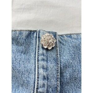 GANNI tops this flared rigid denim bustier with rhinestone floral button accents for a statement finish. Front hook-and-eye corset closures. Interior boning.