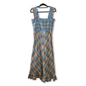 GANNI SEERSUCKER CHECK SLEEVELESS MIDI DRESS smocked cotton summer 42 L