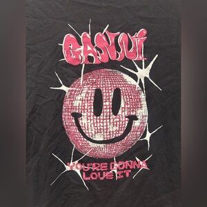 Smiley Relaxed T-Shirt in black by Ganni. This Smiley Relaxed T-shirt is made from certified organic cotton. The t-shirt is designed for a relaxed fit and features a round neckline, GANNI logo, smiley graphic and a 'You're Gonna Love It' graphic.