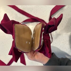 Technical satin heels in black. Bow accent at vamp. · Open square toe · Strap at vamp · Self-tie ankle strap · Logo embossed at biodegradable leather footbed · Covered stiletto heel with rubber injection ·