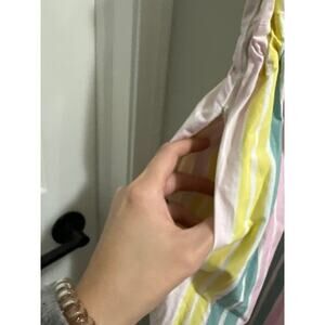 The day dress your spring wardrobe has been missing. This voluminous GANNI dress juxtaposes whisper-thin shoulder straps with a voluminous fit, and is accented with a mix of pastel stripes. Slender inset ties add emphasis to the waist.