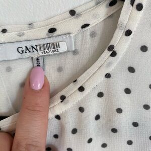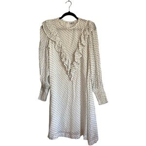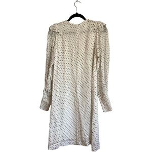 White polka dot printed crepe (100% Viscose). Shift. Long sleeves. Crew neckline. Hidden back zipper closure.