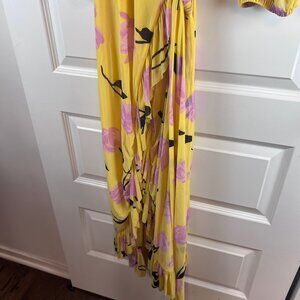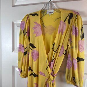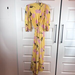 GANNI Yellow Pink Floral Wrap Maxi Dress Balloon Sleeve Boho Romantic Size 4
