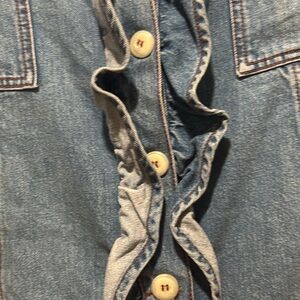 Ganni Benedict denim mini skirt. Button down with ruffle detail. Two front pockets and belt loops. No callouts to note. Euro 36 is equal to a us 4