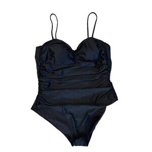 New with Tags $195, Ganni women's Black Ruched Accent One Piece Swimsuit, size 48 EU = 16 XXL US, fully lined, adjustable spaghetti straps, lightly padded built-in bra.