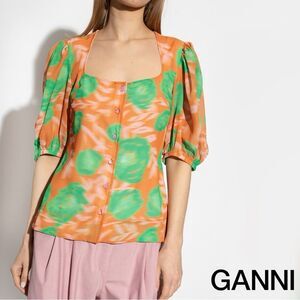 GANNI **NWT** Button-Up Puff Sleeve Crepe Blouse Vibrant Orange / Green Floral