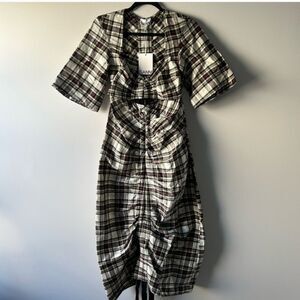 Characteristically bold in its finish, this GANNI midi dress is decorated with black and white plaid checks that are distorted through the use of gathering and ruching.
