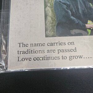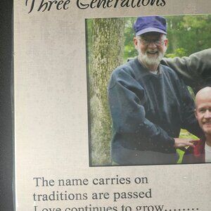 A lovely aluminum metal new picture frame by Ganz. Wording on the frame says: Three Generations. The name carries on the traditions are passed- Love continues to grow. Holds a 5 by 7 inch photo and actual frame itself is 8 by 10 inch. When you receive this frame, there is a protective plastic film on the metal frame that you will remove by peeling it off. In my photo it is still on to protect the frame. This frame is not a wall mount but a table top single picture frame. Color is silver. Frame materials aluminum. Back size black velvet like. Condition: New, pre-owned, never used. Non-smoking pet free home.