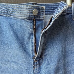 Excellent preowned condition wide leg trouser crop jeans from GAP 1969. Medium indigo wash. Zipper fly and button closure. 2 front slash pockets and 2 back patch pockets. 99% cotton 1% spandex. Belt loops. Machine washable. Clean. No flaws.