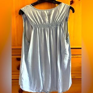 Tencel denim tank top with gathered detail on each strap in front and along the back. V-neck. Comfortable and really cute on. No stains or holes. Comes from pet free smoke free home.