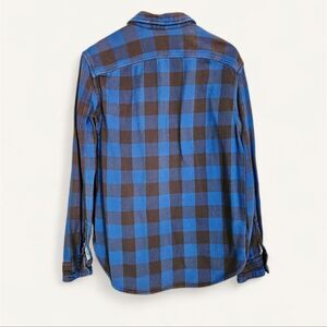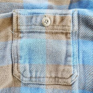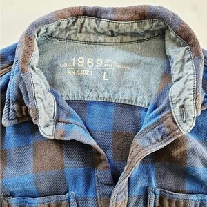 Comfy long sleeve button down shirt from GAP 1969. 100% cotton in a brushed blue and grey checkered plaid. Thick material. Double breast pockets. Lightly pre-owned.