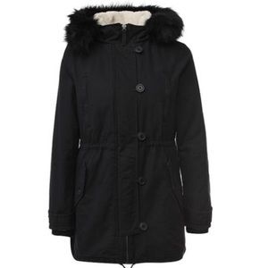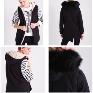 Black parka with removable fur hood. Can cover to vest as well.