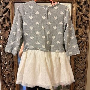 Adorable gray dress with white heart patterns and a tulle skirt. Perfect for a cute and stylish look.